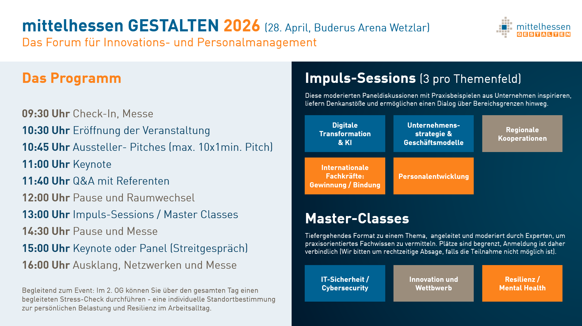 Genau hier setzt mittelhessen GESTALTEN an: Das Event bringt Entscheider:innen aus Geschäftsführung, Innovation, Digitalisierung und HR zusammen. In ein Forum, an dem Transformation gedacht wird. Was Sie erwartet: Eine ganztägige, kostenfreie Präsenzveranstaltung mit über 250 Teilnehmenden aus Wirtschaft, Institutionen und regionalen Netzwerken.