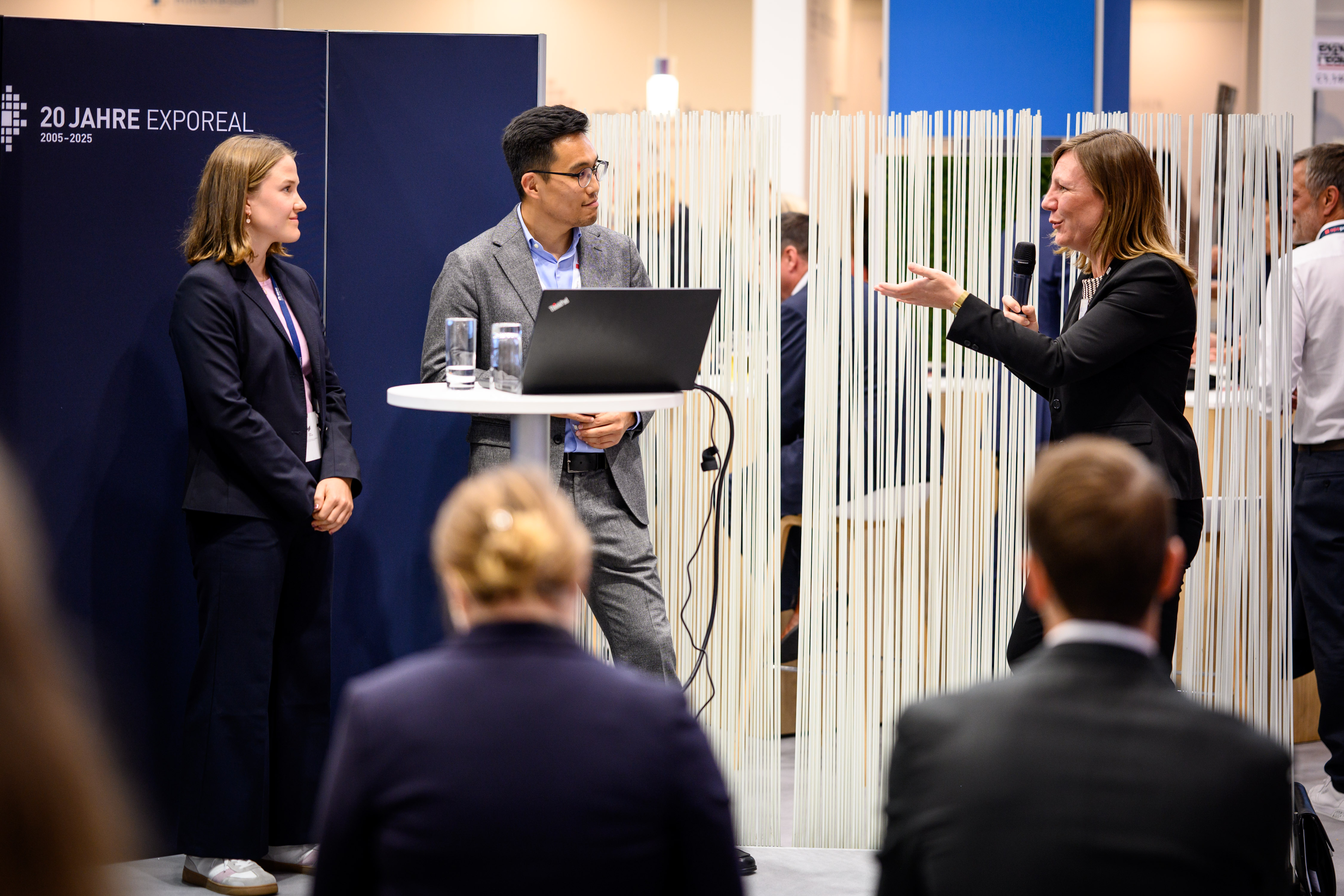 Künstliche Intelligenz in der Immobilienbranche – Chancen für Investments, lautete der nächste Talk. Datenverfügbarkeit, Transparenz und Transaktionsentscheidungen: Dr. Gesa Crockford von ImmoScout24, Alexandre Grellier von Drooms und Jörn Burghardt von GPEP diskutieren über digitale Prozesse von der Wohnungssuche bis zur Miettransaktion.