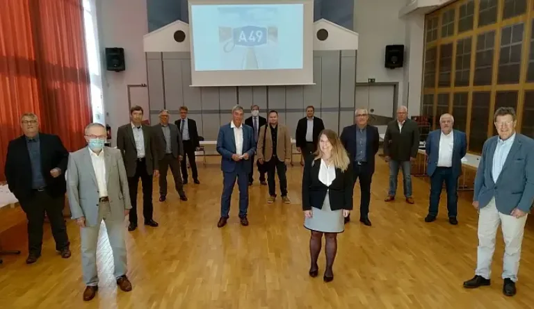 Der Arbeitskreis traf sich in der Stadthalle Stadtallendorf, in unmittelbarer Nähe der Ausstellung, in der die DEGES (Deutsche Einheit Fernstraßenplanungs- und -bau GmbH) über den Weiterbau der Autobahn informiert und ihre Sprechstunden abhält. Vor Ort war auch ein Vertreter der STRABAG Infrastrukturprojekt GmbH, die sich bei einer europaweiten Ausschreibung im Wettbewerb durchgesetzt hat. Als Auftragnehmer des Projektes in öffentlich-privater Partnerschaft (ÖPP) übernimmt die STRABAG Betrieb und Erhaltung der insgesamt rund 62 Kilometer langen Projektstrecke über einen Zeitraum von 30 Jahren sowie die anteilige Finanzierung der Leistungen. Die Laufzeit des Vertrages begann am 1. September 2020 und damit genau am Tag der Sitzung des Arbeitskreises.Auf Anregung der Unterstützer gibt es seit kurzem auch Aufkleber, mit denen die betroffenen Menschen öffentlich „JA49“ zeigen können. Diese können wie weitere Informationen unter www.ja49.de angefordert werden.