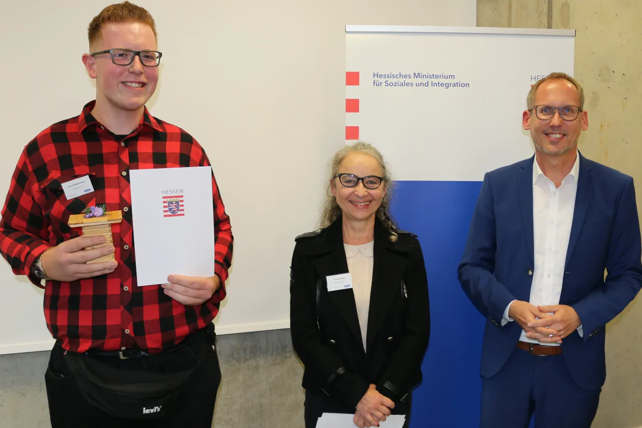 Preisübergabe an das Unternehmen MarMed GmbH – Cölbe: Timon Willershausen, Corinna Drobe, Staatsminister Kai Klose (v.l.n.r., Foto: © BWMK (Behindertenwerk Main Kinzig))Auch deshalb sei in diesem Jahr beim Anerkennungspreis – dem Landespreis für Inklusionsbetriebe – der Schwerpunkt auf das Thema Ausbildung von Menschen mit Behinderungen gelegt worden. Mit dem zum zweiten Mal vergebenen Preis macht das Hessische Ministerium für Soziales und Integration auf den besonderen gesetzlichen Auftrag der Inklusionsbetriebe aufmerksam. Ausgezeichnet wurde die MarMed GmbH aus Cölbe, die Praxisbedarf und Ausstattung für Tierarztpraxen und Tierkliniken vertreibt. „Sie bieten Menschen mit Beeinträchtigungen einen Ausbildungs- und Arbeitsplatz mit entsprechender Betreuung und haben das Ausbildungsgehalt ihrer Mitarbeitenden freiwillig angehoben – dadurch vermitteln sie nicht nur Anerkennung und Wertschätzung für ihre Arbeit, sondern stärken auch das Selbstvertrauen ihrer Angestellten“, sagte Minister Klose in seiner Laudatio. Mit dem Landespreis für beispielhafte Beschäftigung wurden drei Unternehmen ausgezeichnet: