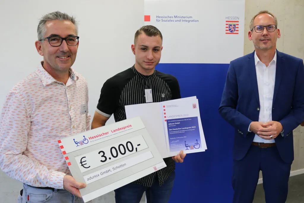 Preisübergabe an das Unternehmen adunox GmbH – Schotten: Said El-Hagge, Dominique Schwarz, Staatsminister Kai Klose (v.l.n.r., Foto: © BWMK (Behindertenwerk Main Kinzig))Der nächste ausgezeichnete Betrieb, die adunox GmbH aus Schotten, ist in der Befestigungsmittelbranche tätig und kooperiert seit seiner Gründung 2010 mit den Werkstätten der Schottener Sozialen Dienste. „Sie gehen ganz selbstverständlich auf die Bedürfnisse ihrer Beschäftigten ein – egal, ob das behinderungsbedingte Fehlzeiten sind, die Verlängerung notwendiger Pausen oder die Gestaltung von Aufgabengebieten – und ermöglichen Ihren Mitarbeitenden so Teilhabe am Arbeitsplatz und bieten echten Team Spirit“, sagte der Minister über das Unternehmen aus dem Vogelsbergkreis.