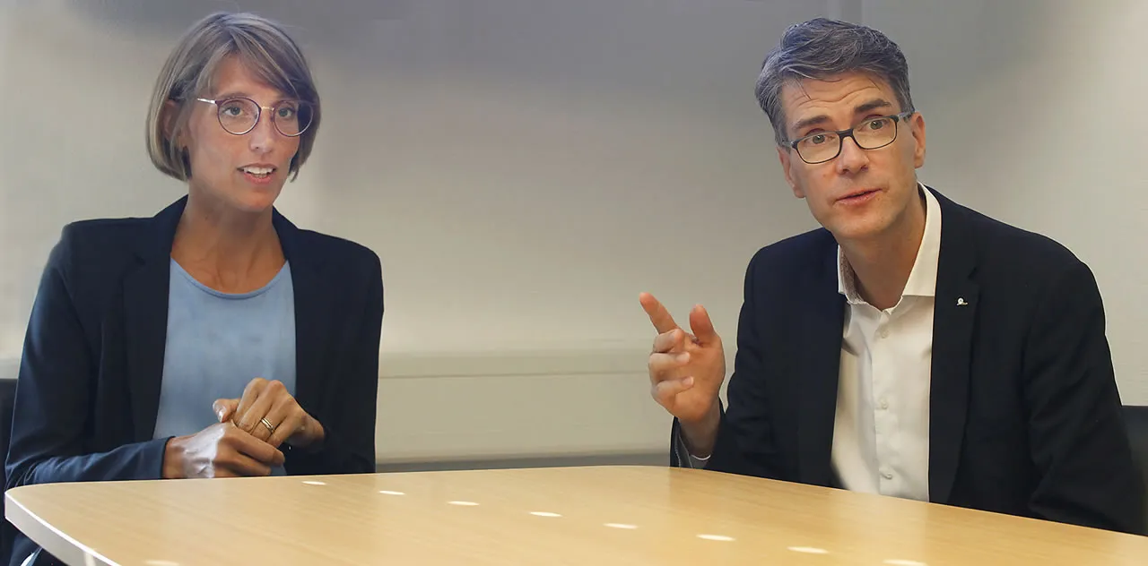 Theresa Großer, Leiterin des internationalen Gymnasialzweigs, und Schulleiter Björn Gemmer (Foto: Internationale Schule)Die ungleichmäßige Nachfrage macht die Planung nicht einfacher, „das kann man überhaupt nicht vorhersehen“, sagt Theresa Großer, Leiterin des internationalen Gymnasialzweiges. Immerhin könne man am Bekanntheitsgrad arbeiten, „da ist noch Luft nach oben“. Großer macht auch deutlich, dass die Steinmühle nicht unbedingt für alle internationalen Schüler geeignet ist, etwa wenn Kinder weder mit Deutsch noch mit Englisch, den beiden Sprachen an der Schule, etwas anfangen können. „Das kann eine große Hürde sein.“ Schwankungen in der Nachfrage könnten auch mit dem Arbeitsmarkt zusammenhängen, „das lässt sich nie wirklich vorhersagen“.