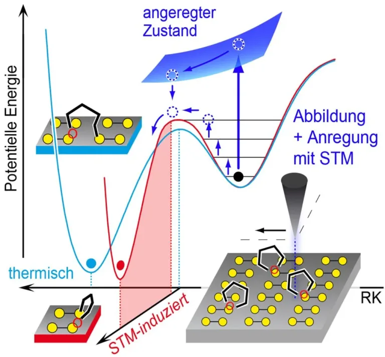 Energie – der „Normalfall“ –, sondern auch durch Anregung der einzelnen Moleküle mittels Elektronen initiiert werden kann. Da mit dem Rastertunnelmikroskop