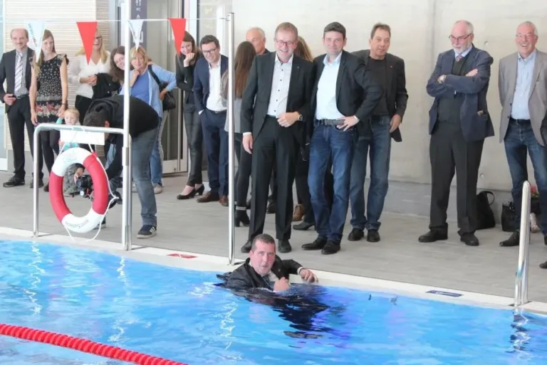 erstmals offiziell in Bewegung gesetzt hatten, mussten auch Hallenbad-Geschäftsführer Thorsten Roth und Architekt Matthias Losacker baden gehen, und