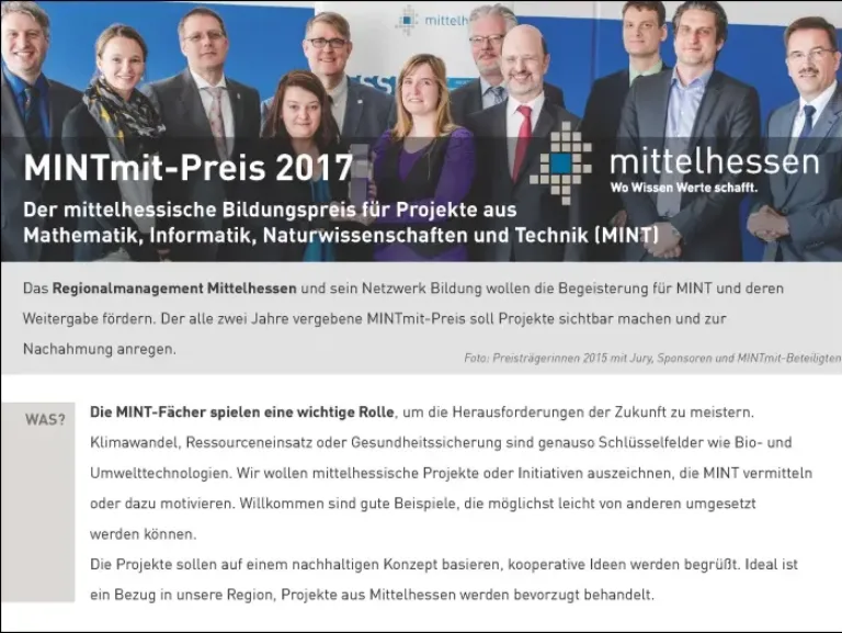 Erstmals findet die Ausschreibung mit Unterstützung der in Heuchelheim ansässigen Schunk Group statt, die als Sponsor das Preisgeld stiftet. „Unsere Unternehmen brauchen Nachwuchs in diesem Bereich“, betonte Ihle. Daher liegt die Förderung der MINT-Fächer auch dem Regionalmanagement am Herzen. Gerade in der Bildungsregion Mittelhessen, die auch stark in Handwerk und Industrie sei, spiele die Förderung junger Talente für die Fachkräftesicherung eine entscheidende Rolle.