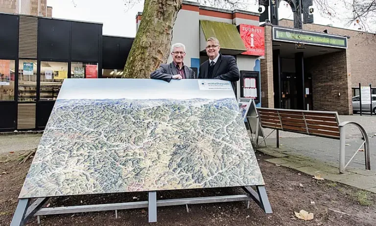 Die RMG hatte die zweieinhalb Quadratmeter große Karte für den Pavillon gestiftet – einem Gemeinschaftsprojekt der Tourismus-Verbände des Vogelsbergs und des Lahntals sowie des Vereins Region GießenerLand und der Gießen Marketing GmbH, um die Region „als interessanten Freizeit- und Lebensraum darzustellen. „Mit dieser Idee waren wir sehr erfolgreich“, berichtete Güleç. Insgesamt sei das Projekt damit auch ein „gutes Beispiel für mittelhessische Kooperationskultur“, betonte Ihle. Und die von dem Panorama-Künstler Alexander Königs gestaltete Karte fand wohl auf diese Weise ihren auch Weg in viele Wohnungen: „Wir haben 7500 Mittelhessen-Karten als Din-A2-Poster auf der LGS verteilt“, fügte Güleç hinzu. Insgesamt 10.000 Stück des Karten-Posters hatte man drucken lassen; die Idee dazu hatte Kurt Hillgärtner, Vorsitzender des Vereins Region GießenerLand.