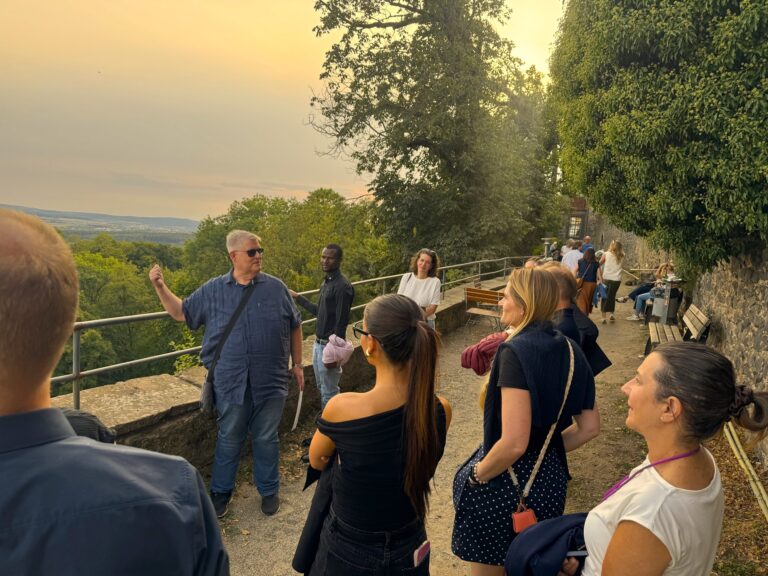Begleitet vom Team des WELCOMECENTER Mittelhessen begrüßte Jens Ihle, Geschäftsführer des Regionalmanagement Mittelhessen, gemeinsam mit einigen Mitarbeiterinnen aus dem Regionalmanagement die Teilnehmenden und führte sie zu einem Aussichtspunkt, an dem sich Geschichte und Gegenwart der Region auf eindrucksvolle Weise verbinden. In kurzen, anschaulichen Geschichten erzählte er vom Umland der mittelalterlichen Klosteranlage, der Bedeutung für die Region und dem Kulturprogramm, das internationale Künstlerinnen und Künstler anzieht.