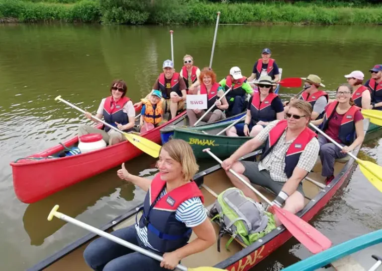 Nach der ersten Paddeletappe, bei der die Teilnehmer mit ihren Familien Schleusen und den Weilburger Schiffstunnel bewältigten, gab es ein großes Picknick. Die Newcomer, die bei den Gießener Hochschulen und den Unternehmen Schunk, PVA TePla, Electrolux und Isabellenhütte Heusler beschäftigt sind, kamen dabei schnell ins Gespräch.