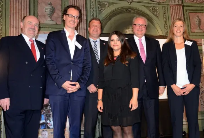 Benennung der neuen Botschafter Mittelhessens Dietrich Faber & Yana Gercke: v.l. Präsident der HWK Wiesbaden Klaus Repp, Dietrich Farber, Regierungspräsident Dr. Lars Witteck, Yana Gercke, Hessens Finanzminister Dr. Thomas Schäfer, Hessischer Rundfunk Constanze Schleenbecker