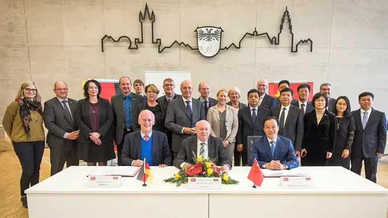 In seinem Grußwort sprach Landrat Wolfgang Schuster über die bereits bestehenden wirtschaftlichen Beziehungen einzelner Unternehmen im Lahn-Dill-Kreis mit China. Die Welt bezeichnete er dabei als ein Dorf, das gemeinsam miteinander kooperieren muss, um die Zukunft aller zu sichern. Schuster freute sich über die Anerkennung, das Interesse der Delegation aus Xuchang an Mittelhessen und über deren Besuch im Kreishaus.Bürgermeister Hu Wuyue stellte seine Stadtregion Xuchang vor: Rund 4,92 Mio. Einwohner hat Xuchang in der Provinz Henan, die insgesamt 100 Mio. Einwohner umfasst. Die Stadt hat mit ihren bisherigen Anstrengungen und Maßnahmen zahlreiche Auszeichnungen erhalten wie z. B. „die Stadt der Kulturen“, „die Stadt der Ökonomie“, „die Stadt des Waldes“ etc. Nun möchte sich Xuchang neben der Vertiefung der Wirtschaftskontakte auf den Ausbau des Gesundheitswesens und des Bildungsbereichs konzentrieren. Aus Sicht von Bürgermeister Hu passt der Zeitpunkt der Vereinbarungsunterzeichnung sehr gut: Nach dem gerade stattgefundenen Parteitag möchte er auf Grund der dort festgelegten Ziele die deutsch-chinesischen Projekte unterstützen. Begeistert zeigte sich Hu von der reizvollen Landschaft Mittelhessens und über Goethes Spuren des „Leiden des jungen Werthers“ in Wetzlar.Rudolf Scharping, der mit seinem Büro die Kontakte zwischen Xuchang und Mittelhessen hergestellt hat, verdeutlichte die wirtschaftliche Wichtigkeit des jeweiligen Exporthandels für China und für Deutschland. Mit den ausgesprochenen Zielen, die berufliche Ausbildung und das Gesundheitswesen auszubauen, kann sehr gut auf die Erfahrungen in Mittelhessen zurückgegriffen werden, verdeutlichte Scharping. Die Themen bieten ein breites Feld von Kommunikationsmöglichkeiten, wobei die Chance zur Win-Win-Situation für beide Seiten ergriffen werden muss. Scharping wünschte den Partnern eine friedliche, gute und gemeinsame Zukunft.Jens Ihle verdeutlichte in seinem Grußwort die Stärke der Region Mittelhessen, gerade im medizinischen Bereich. Mittelhessen kann sich mit dem Universitätsklinikum Gießen-Marburg (UKGM) als drittgrößtes Uni-Klinikum in Deutschland nach Berlin und Hamburg einreihen. Die Universitäten Marburg und Gießen bilden seit fast 450 bzw. 500 Jahren aus und zählen zu den ältesten in Deutschland. Die Studierendendichte der Universitäten zusammen mit der Technischen Hochschule Mittelhessen (THM) und StudiumPlus in Wetzlar beträgt mehr als 71.000 Studierende auf 1 Mio. Einwohner – das ist die größte Studierendendichte in Deutschland. Ihle freute sich bei der Vereinbarung auf die weitere Vernetzung nach außen und auf eine für alle Seiten nützliche Kooperation.Nach den Grußworten fand die feierliche Unterzeichnung des „Memorandum of Understanding“ statt.