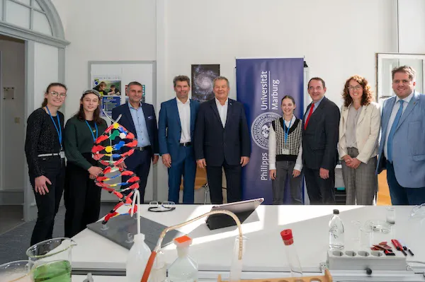 Sie haben das Schüler:innenforschungszentrum Mittelhessen als neue Anlaufstelle für MINT-Talente eröffnet (von rechts nach links): Erster Kreisbeigeordneter des Landkreises Marburg-Biedenkopf Marian Zachow, Wissenschaftsministerin Angela Dorn, Kultusminister Prof. Dr. Alexander Lorz, Schülerin Leevke Filipski, Marburgs Oberbürgermeister Dr. Thomas Spies, Universitätspräsident Prof. Dr. Thomas Nauss, Gunnar Merle (Schulleiter der Elisabethschule und Vorstand des Trägervereins SFM) sowie die Schülerinnen Tina Landstein und Hannah Gerhard, die am Mint-Sommercamp teilgenommen haben. Foto: Markus Farnung