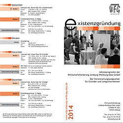 Die Wirtschaftsförderung Limburg-Weilburg-Diez (WFG) hat ihren diesjährigen Veranstaltungswegweiser für Gründer und Jungunternehmer vorgelegt – ein „vielfältiges Angebot für potentielle Existenzgründerinnen und -gründer und Unternehmen der Region Limburg-Weilburg-Diez“, wie die WFG schreibt. In den Informationsveranstaltungen, Seminaren und bei den Beratungsterminen sollen Gründer und Unternehmen zeitnah, objektiv und umfassend beraten werden.