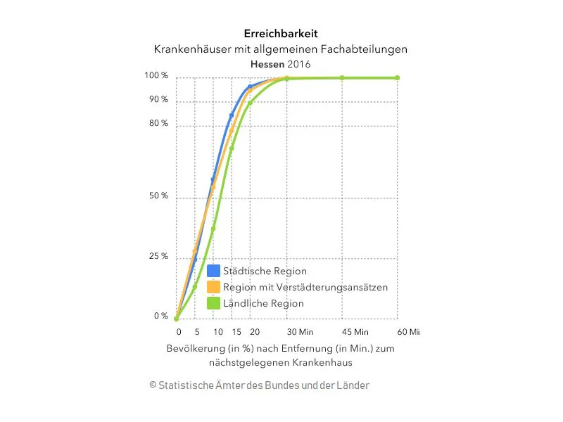 In ländlichen Regionen schaffen dies nur gut 64 Prozent der Bevölkerung. Diese Erreichbarkeiten ergeben sich aus dem neuen Krankenhaus-Atlas der Statistischen Ämter des Bundes und der Länder.