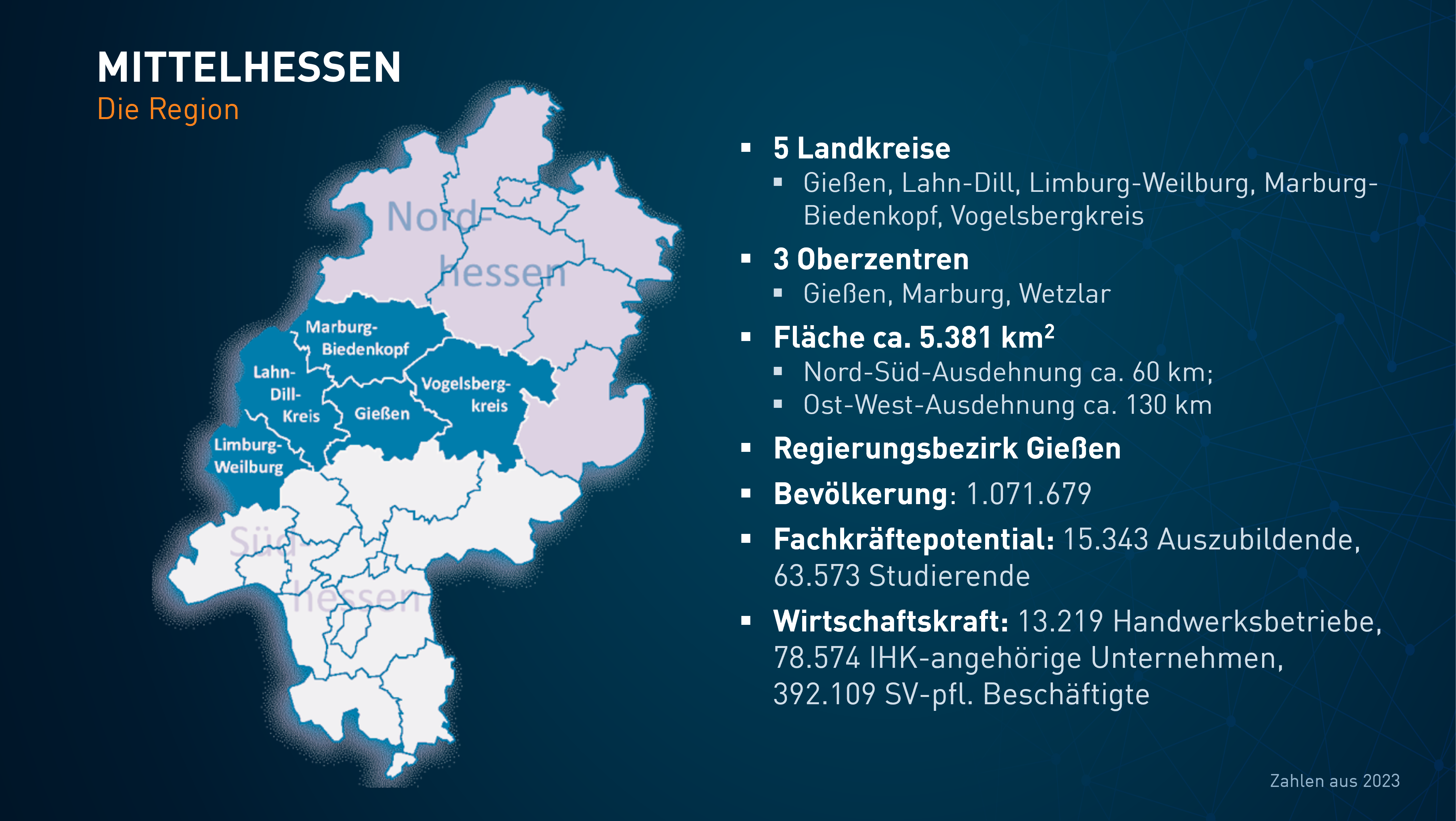 Und auch Fragen zu Mittelhessen selbst sind gerechtfertig, weil viele Menschen die noch relativ „junge“ Region nicht genau kennen. Weder ihre geografischen Grenzen, noch ihre wirtschaftliche Stärke, Bildungseinrichtungen oder Infrastruktur. Mittelhessen ist so vielseitig: es verbindet städtische Zentren, ländliche Gemeinden, Wirtschaft, Wissenschaft und Kultur so gemeinschaftlich, sodass die Zusammenhänge oft nicht auf den ersten Blick erkennbar sind.