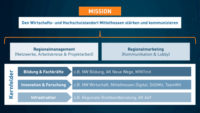 Unsere Mission: Den Wirtschafts- und Wissenschaftsstandort Mittelhessen stärken und sichtbar machen – durch die strategische Positionierung der Region. Dazu verbinden wir zwei Disziplinen.