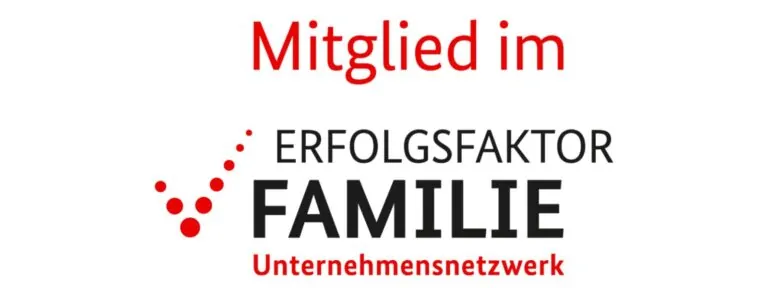 Wir sind Mitglied im Unternehmensnetzwerk „Erfolgsfaktor Familie“. Mit dem Logo wollen wir nach außen und innen zeigen, dass in unserem Unternehmen und unserer Personalarbeit die Vereinbarkeit von Beruf und Familie eine große Rolle spielt.