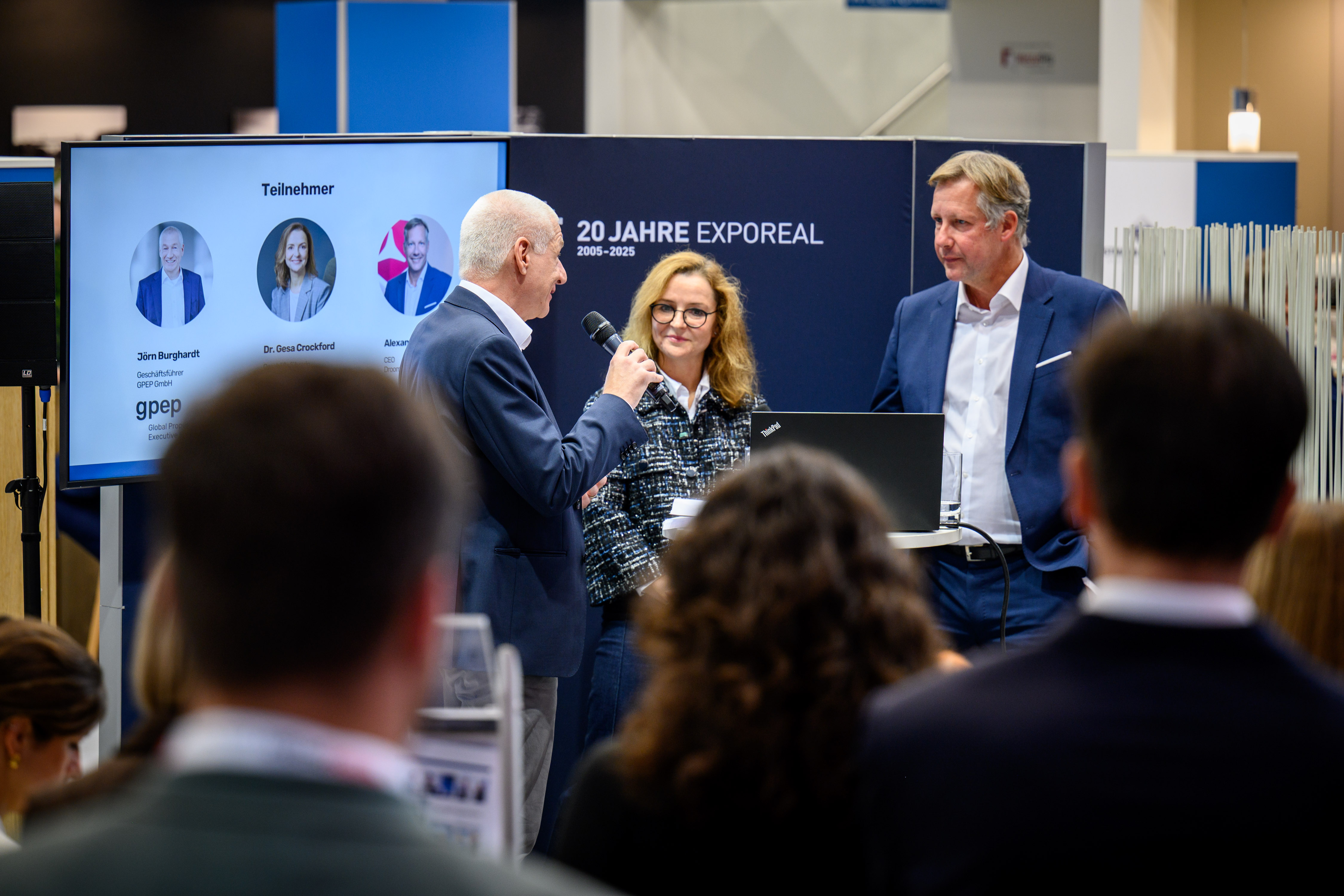 Künstliche Intelligenz in der Immobilienbranche – Chancen für Investments, lautete der nächste Talk. Datenverfügbarkeit, Transparenz und Transaktionsentscheidungen: Dr. Gesa Crockford von ImmoScout24, Alexandre Grellier von Drooms und Jörn Burghardt von GPEP diskutieren über digitale Prozesse von der Wohnungssuche bis zur Miettransaktion.